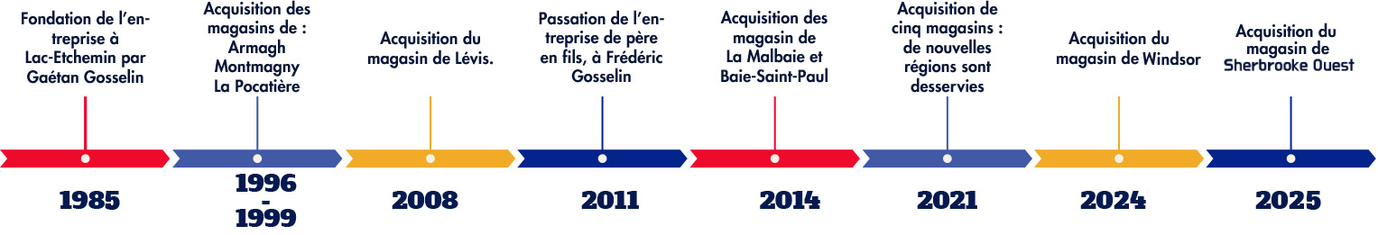 C’est en 2011 que Gaétan Gosselin a vendu son entreprise à son fils, Frédéric Gosselin. Ce dernier fait croître l’entreprise à son tour : il poursuit l’expansion de l’entreprise fondée par son père, ayant entre autres acheté les magasins corporatifs de Baie-Saint-Paul et de La Malbaie en 2014.